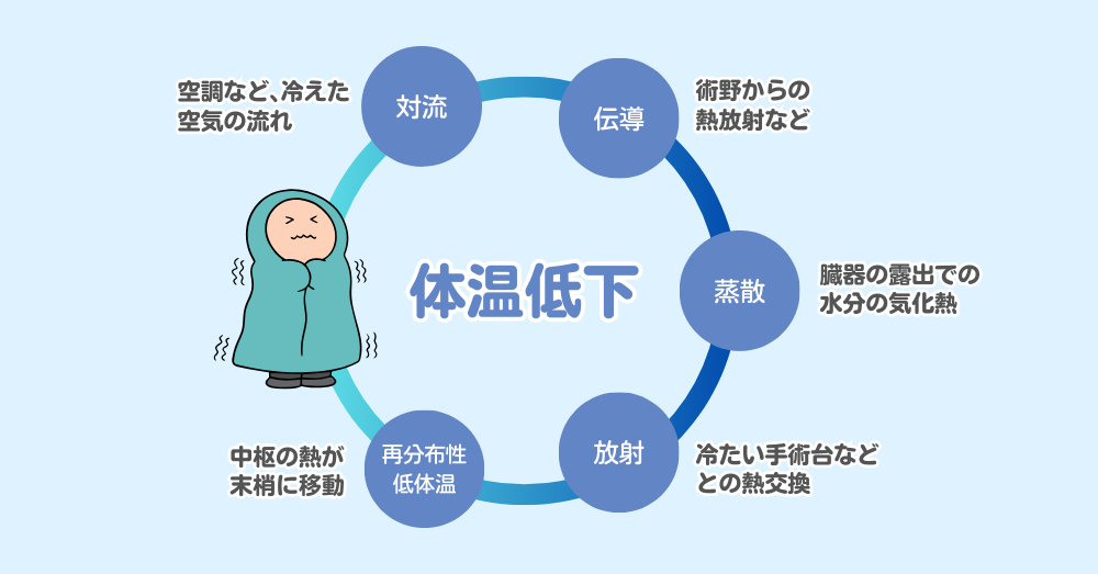 手術中は、複数の要因が重なって体温が低下しやすい状態です。