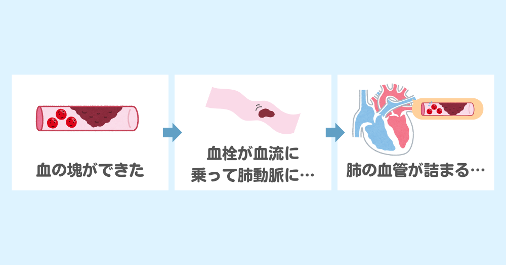 この血栓が血流に乗って肺動脈まで流れ、肺の血管を塞いだ状態がPTE(肺血栓塞栓症)です。