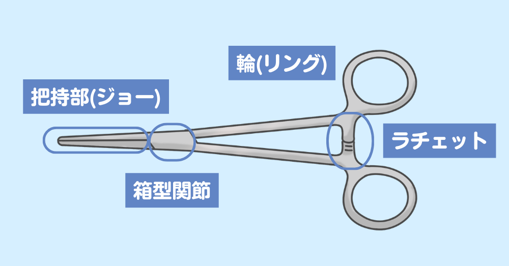 鉗子は、主に組織を把持・牽引する器械で、持ち手にラチェットが付いているのが特徴です。